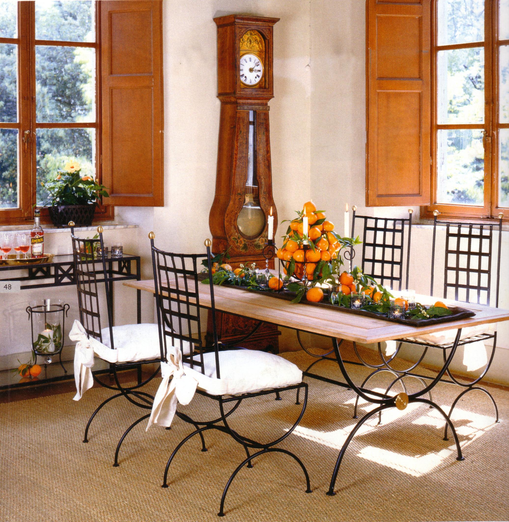 Frumusetea consta in faptul ca cele doua elemente se pot armoniza perfect, creand combinatii stralucite in special la mese , unde eleganta si frumusetea lemnului se poate sincroniza perfect cu suportul trainic si robust, dar elegant forjat si ornat, din fier masiv.